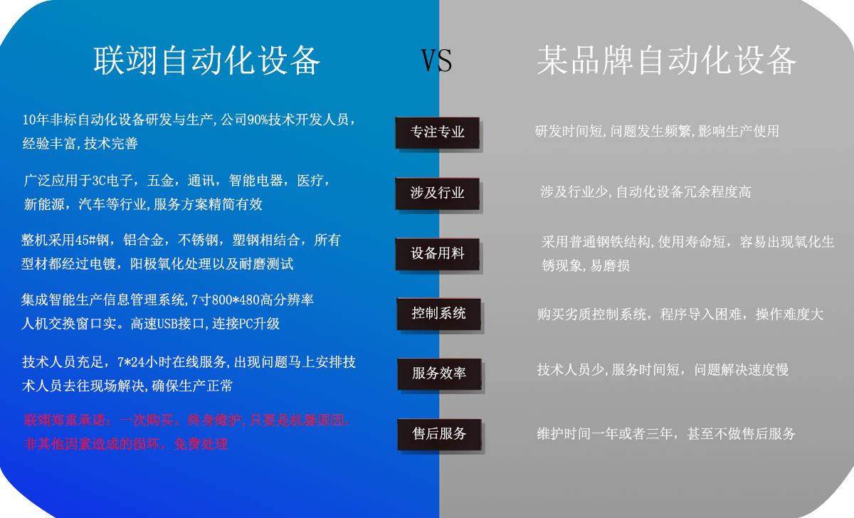 東莞市聯翊智能設備科技有限公司是一家集研發、制造、銷售、服務于一體的自動化設備生產企業。位于東莞市長安鎮上朗路53號。主要致力于自動化裝配生產線,自動組裝機,非標自動化設備等產品研發,產品涉足五金建材,汽車電子,智能家居,,3C行業,醫療器械,新興能源及機器人應用等眾多行業;擁有20年自動化設備研發生產經驗,產品遠銷海內外,品質與服務一致認可,現已成為中國自動化設備贏領企業,聯翊人一直本著“誠信、務實、專注、創新”的核心價值理念,提升企業生產效率,助力企業快速邁向自動化。